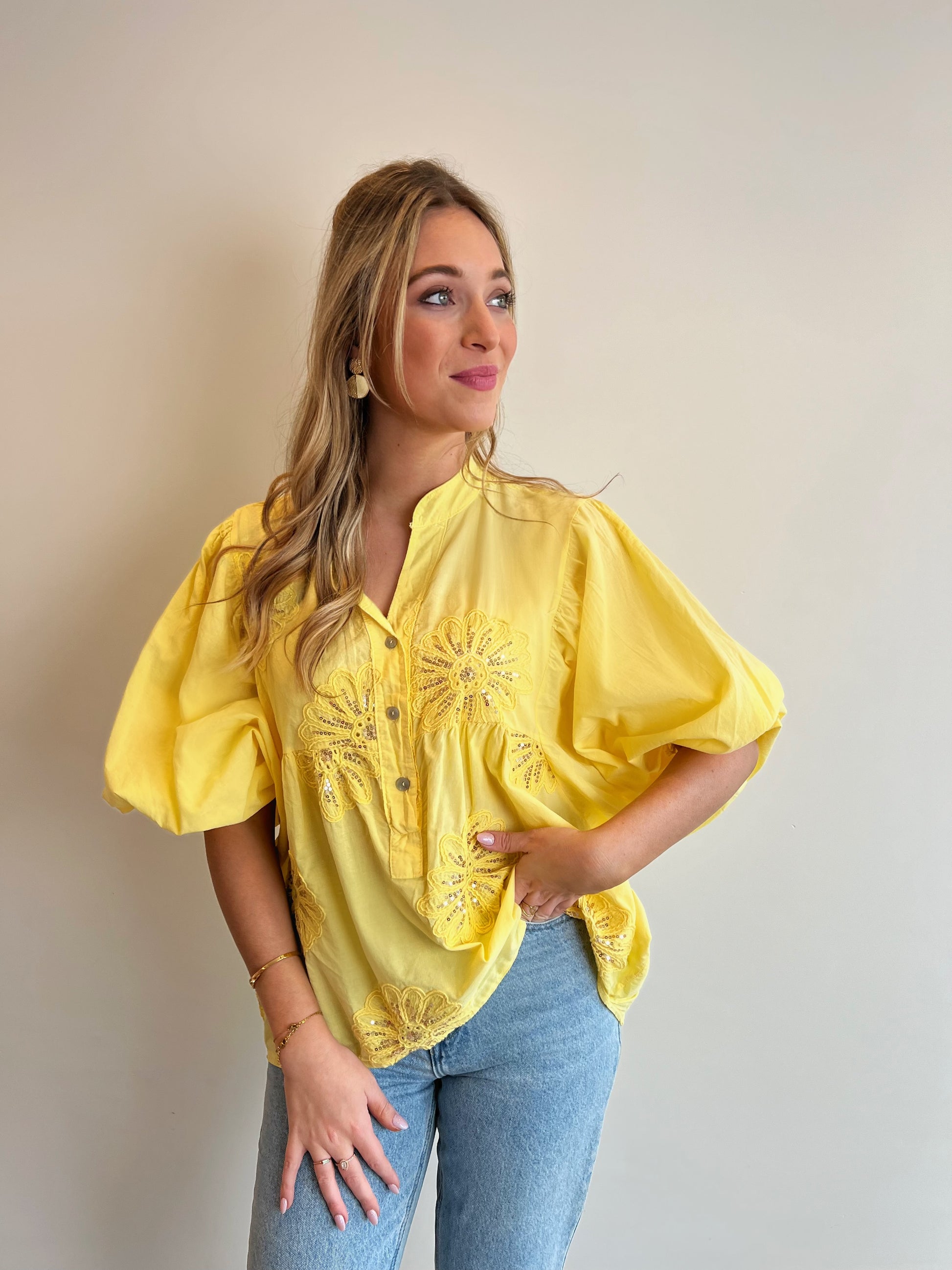 Met rekker aan de mouw. Kan zowel hoog als laag gedragen worden aan de mouwen. Achteraan zijn er geen bloemen. De bloemen hebben pailletten.