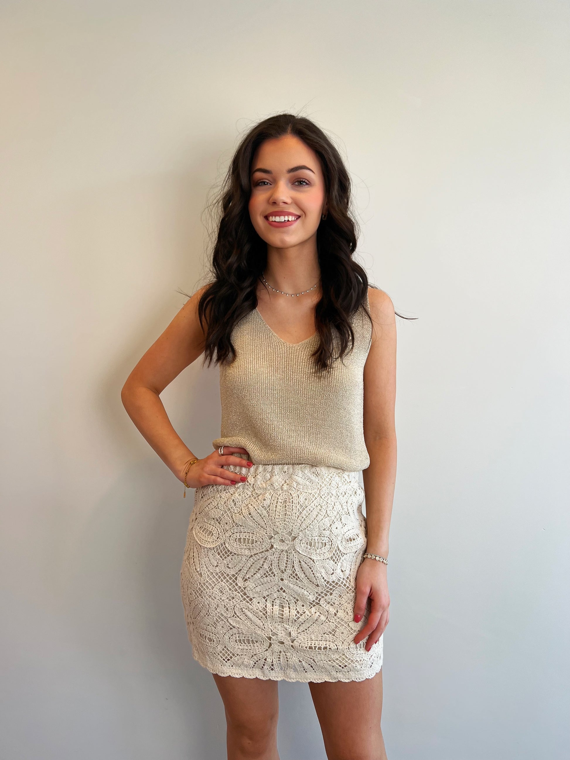 De rok heeft een rekker aan de taille en is gevoerd langs binnen.