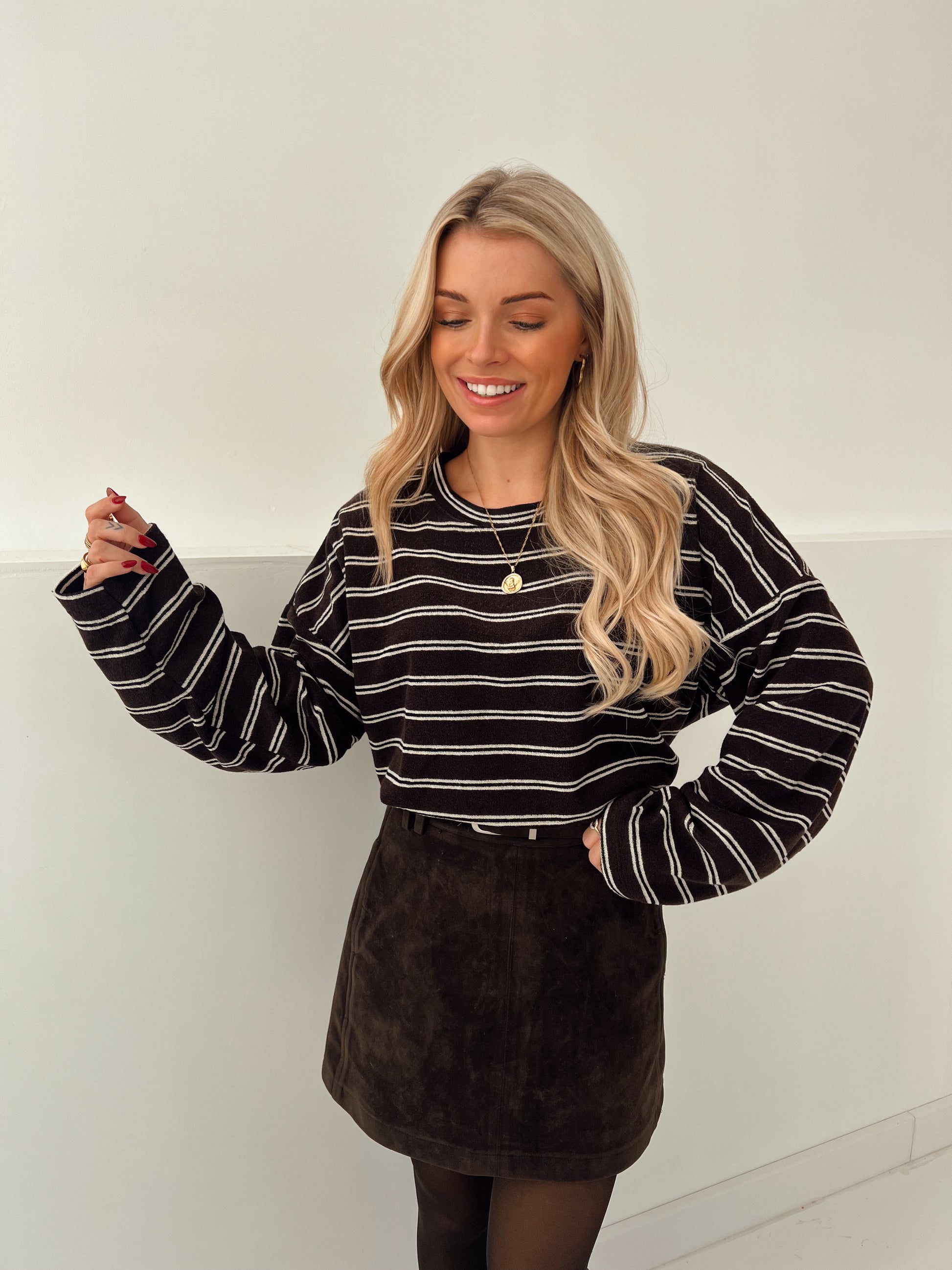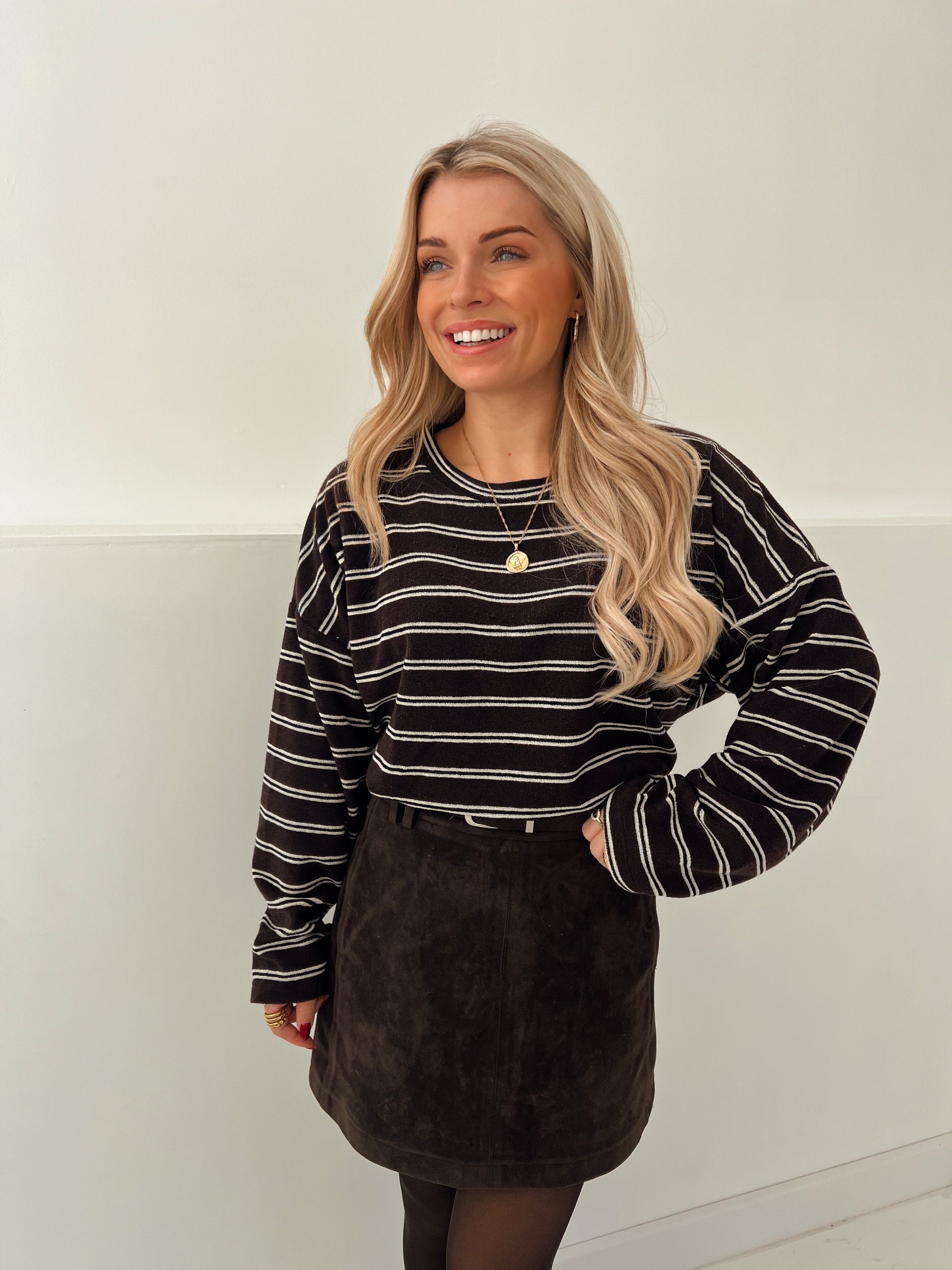 Trui in zachte epoche (badstof). India combineert hem op de foto met onze Margaux Suede rok in het bruin.