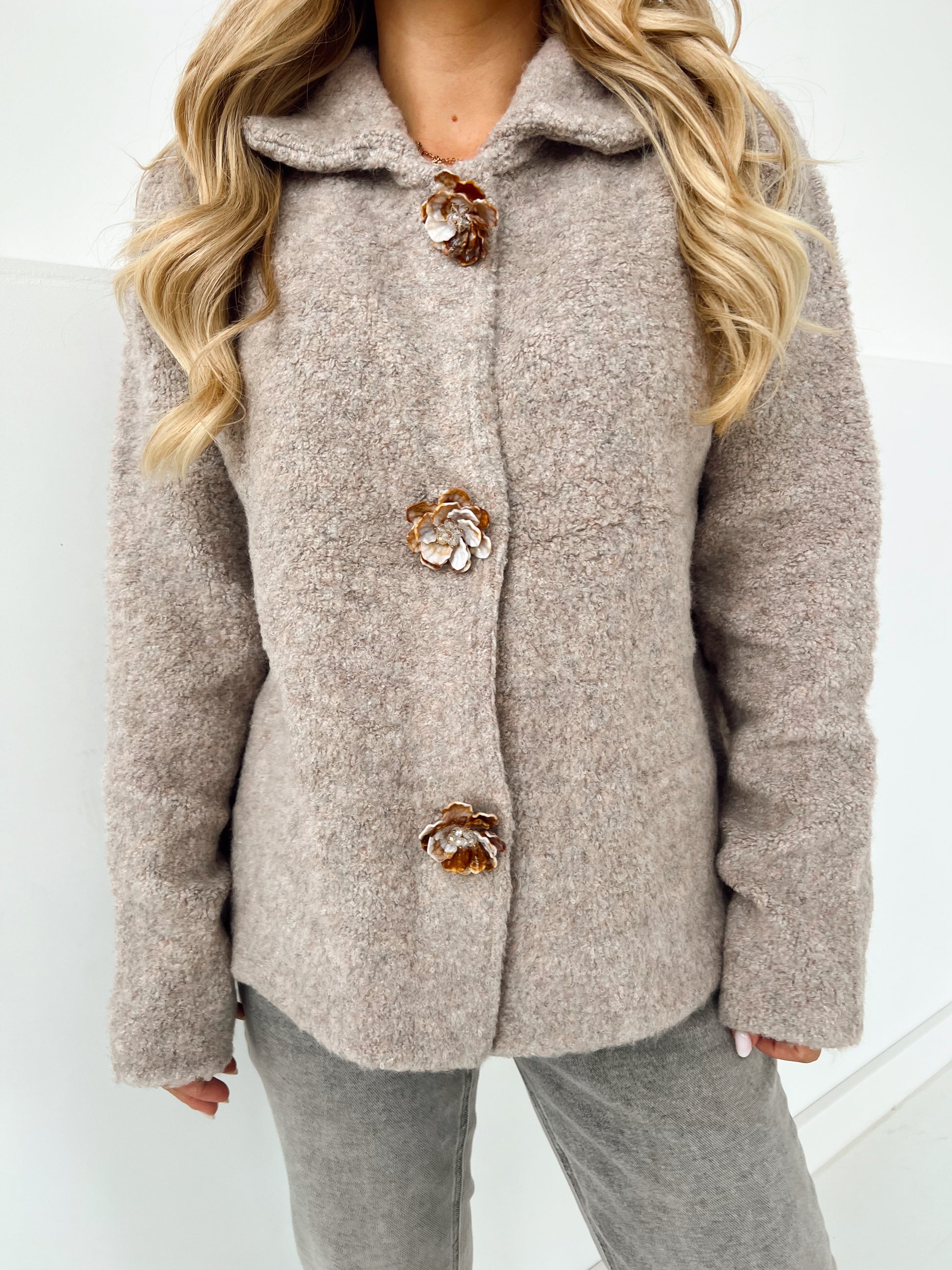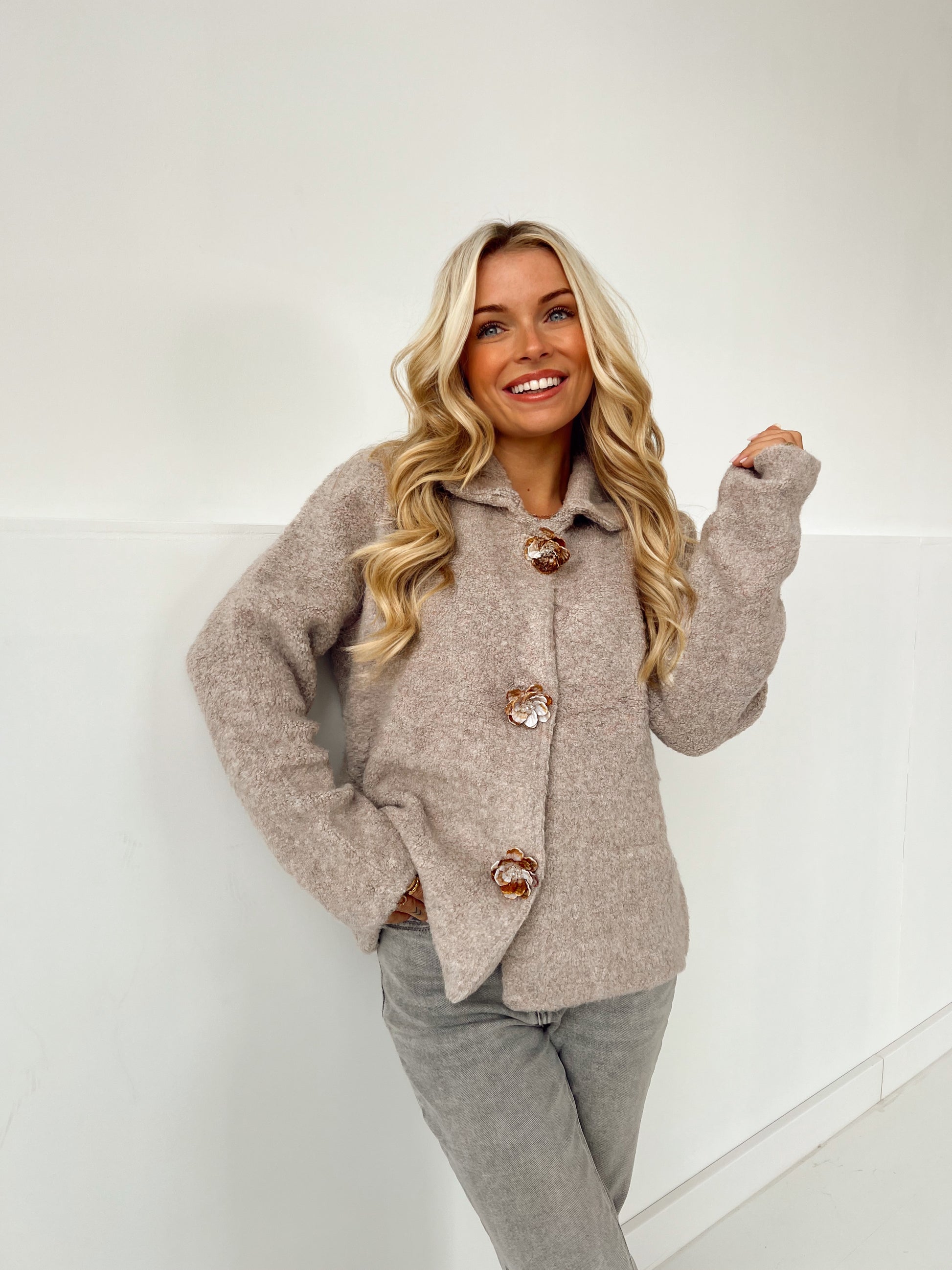 Zachte, warme gilet. De bloemen zijn eigenlijk speldjes die je er ook kan afhalen. Handig tijdens het wassen.