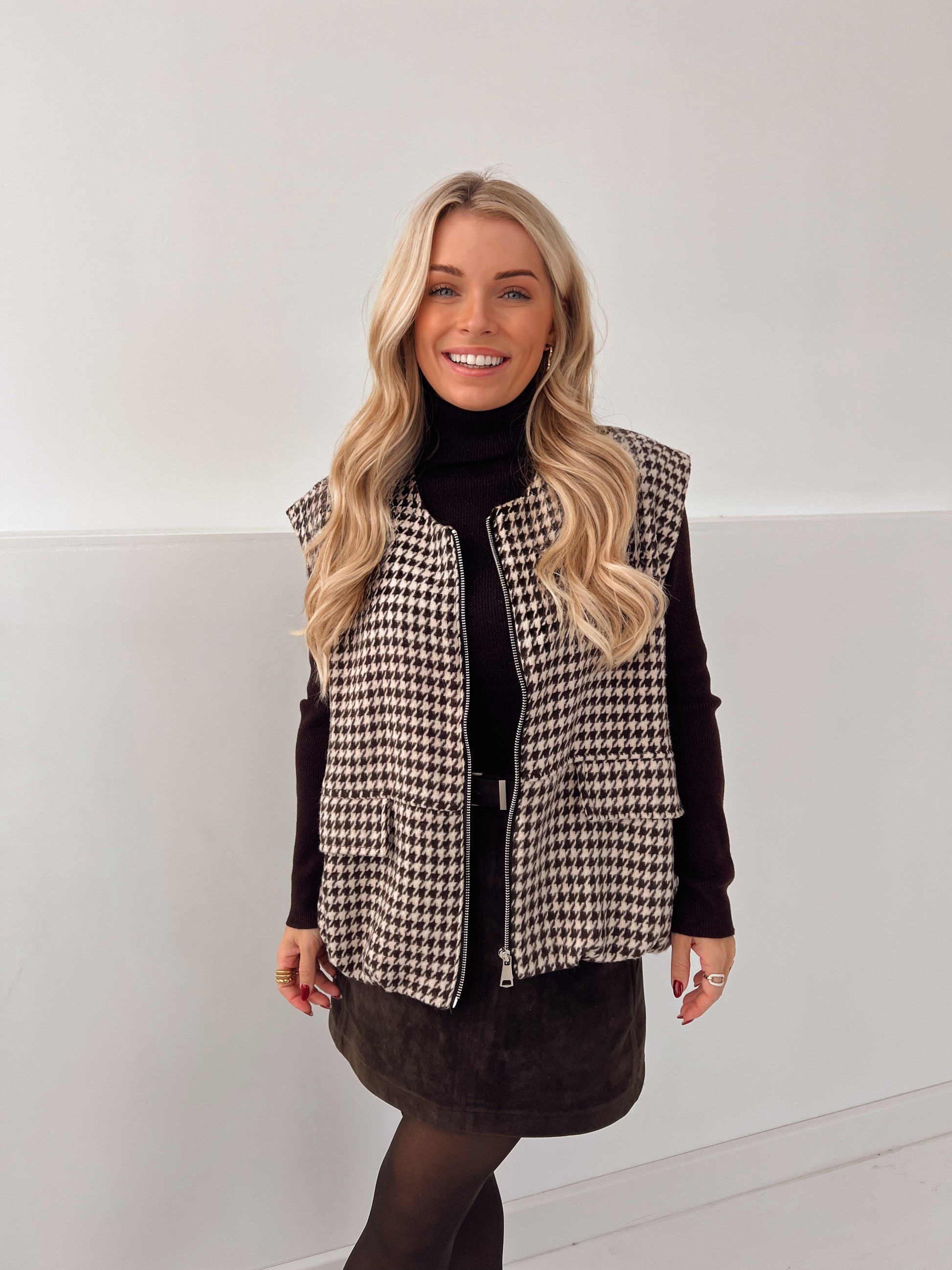Deze gilet is zacht dankzij de stof en heerlijk warm. India combineert hem met onze Liese rolkraag en Margaux suede rok.