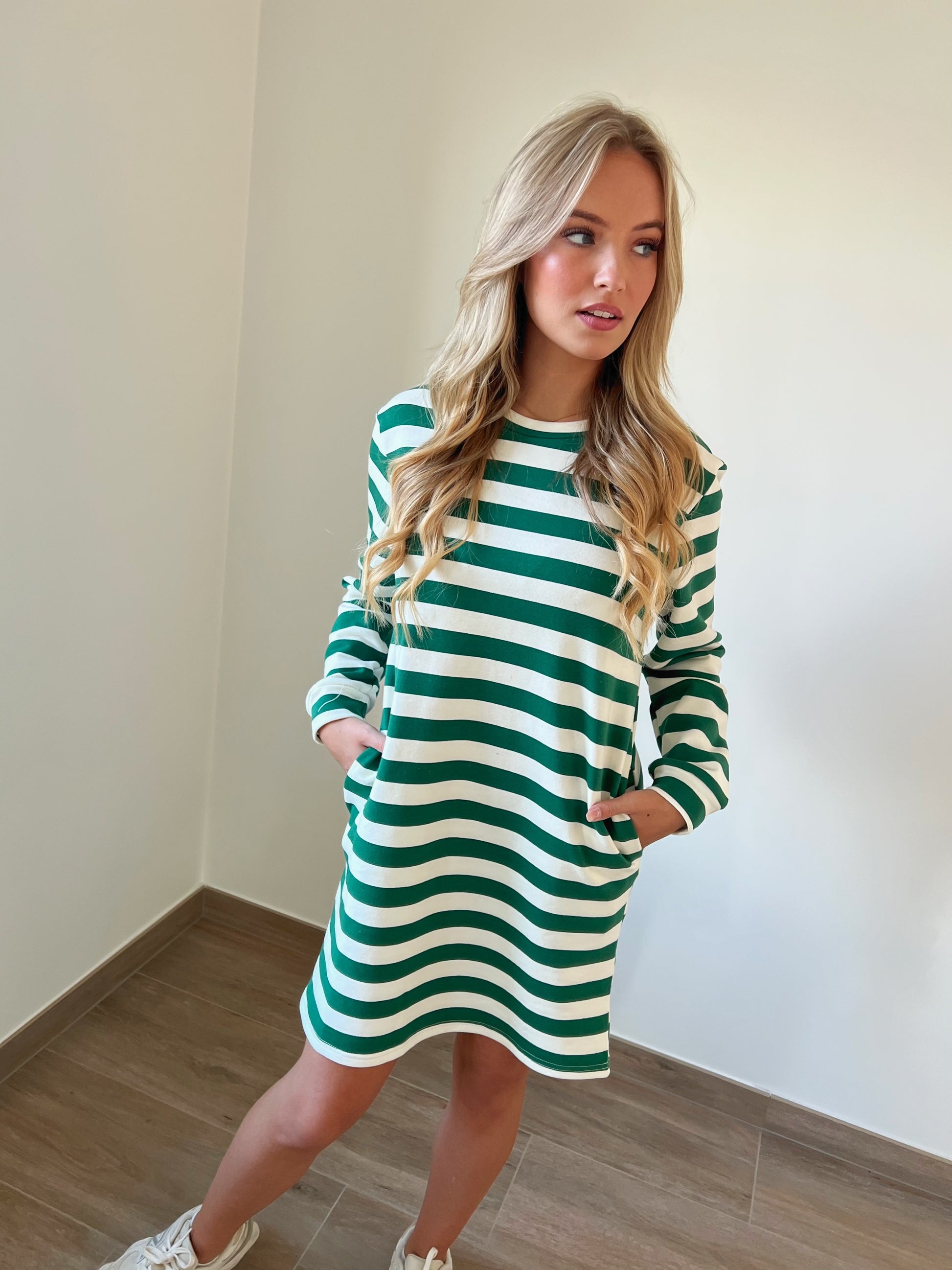 De jurk heeft steekzakken aan de zijkant en is gemaakt uit een zachte aangename sweater stof.