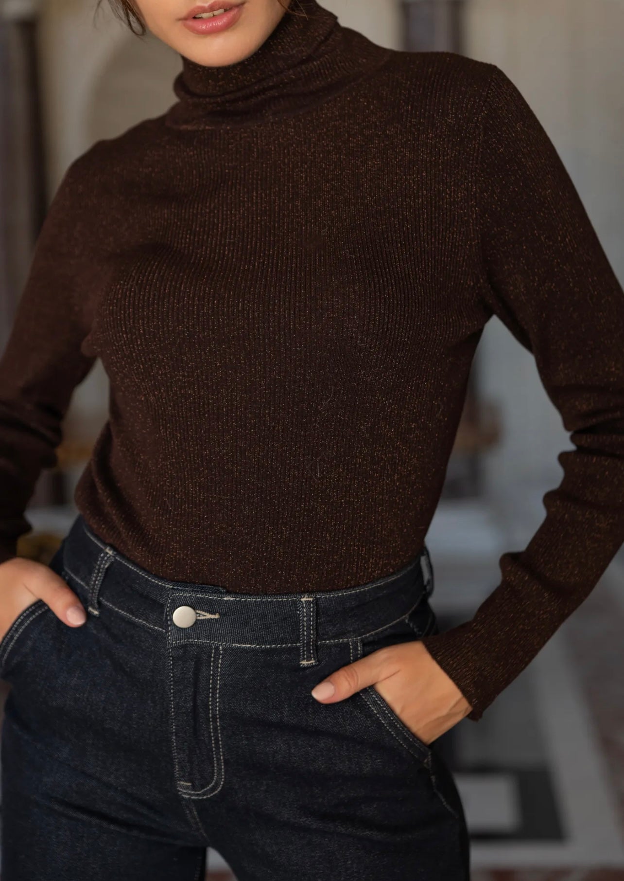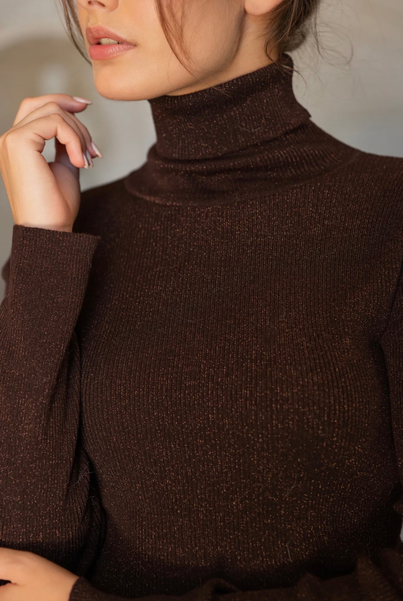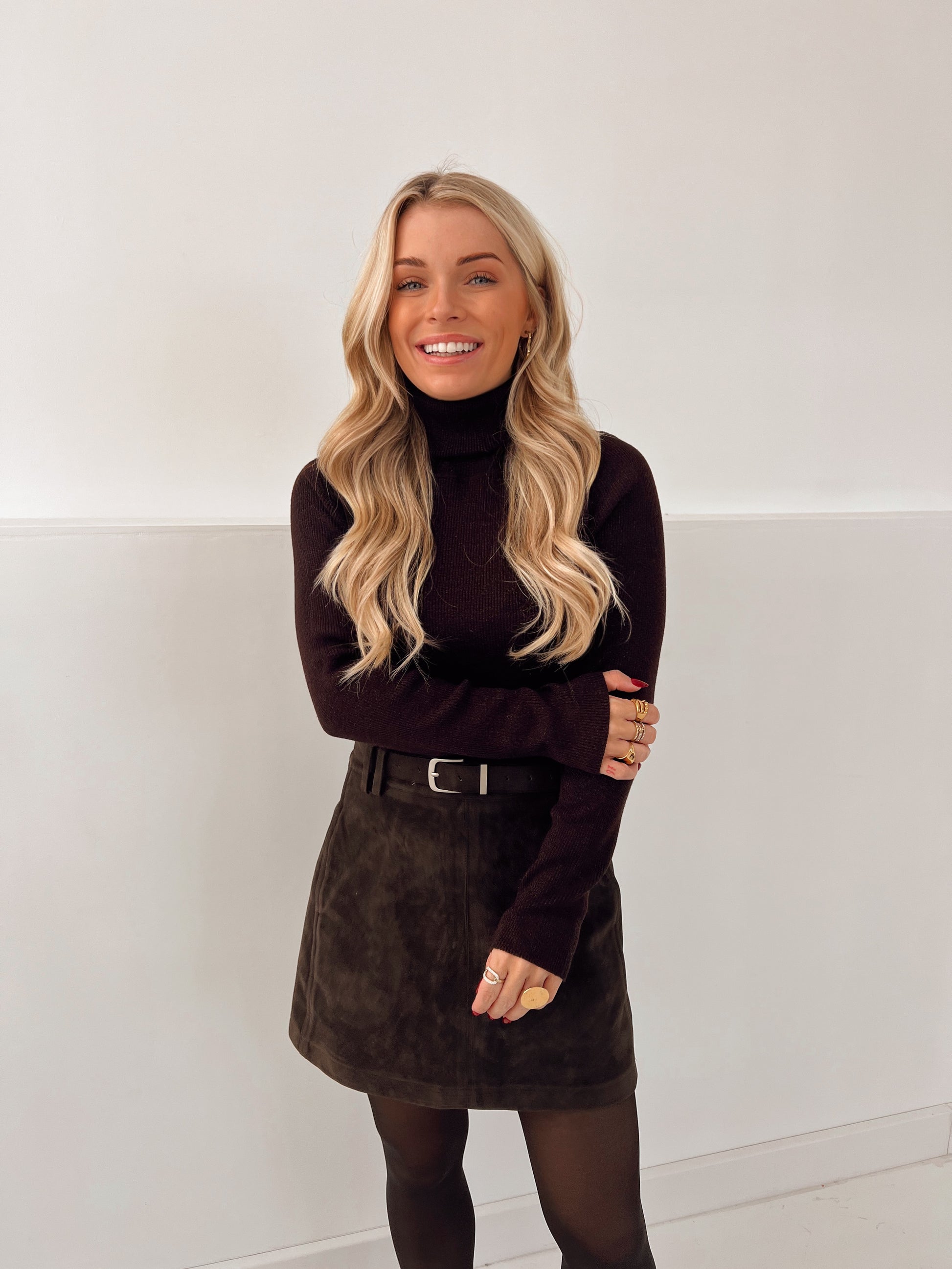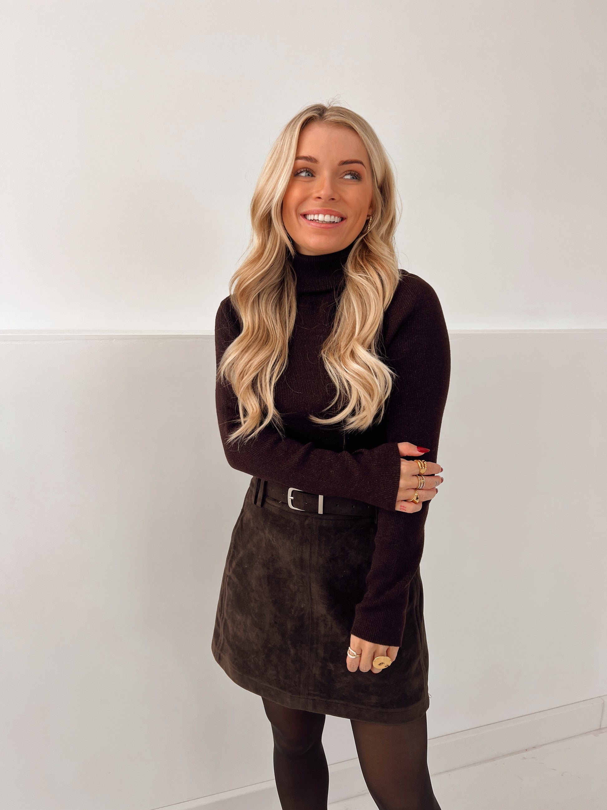 De rolkraag is heel zacht en heeft een fijn lurex draadje dat glinstert. Heerlijk om te dragen. India combineert hem op de foto met onze Margaux Suede rok in het bruin. Bevat stretch.